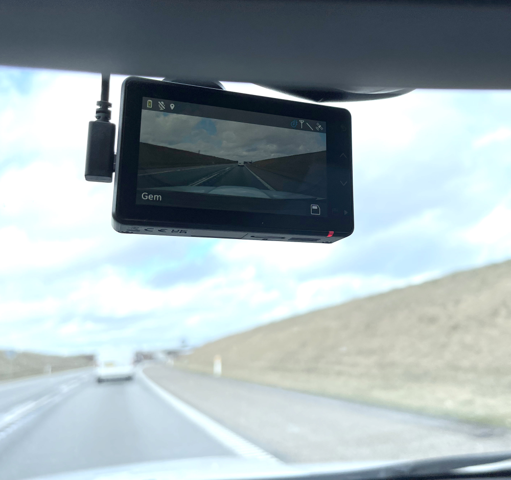 Her opstår mit første dilemma, i det jeg ikke ønsker at mindske mit udsyn fra forruden. Derfor placerer jeg kameraet øverst i midten lige foran bakspejlet. Der kan jeg næsten ikke se kameraet og tak for det.