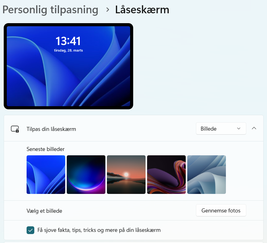 Der finder du ’Tilpas din Låseskærm’, hvor du i undermenuen finder fluebenet ’Få sjove fakta, tips, tricks og mere på låseskærmen’. Den kan du med fordel slå fra, hvis du selv vil styre, hvad dit styresystem skal eksponere dig for.