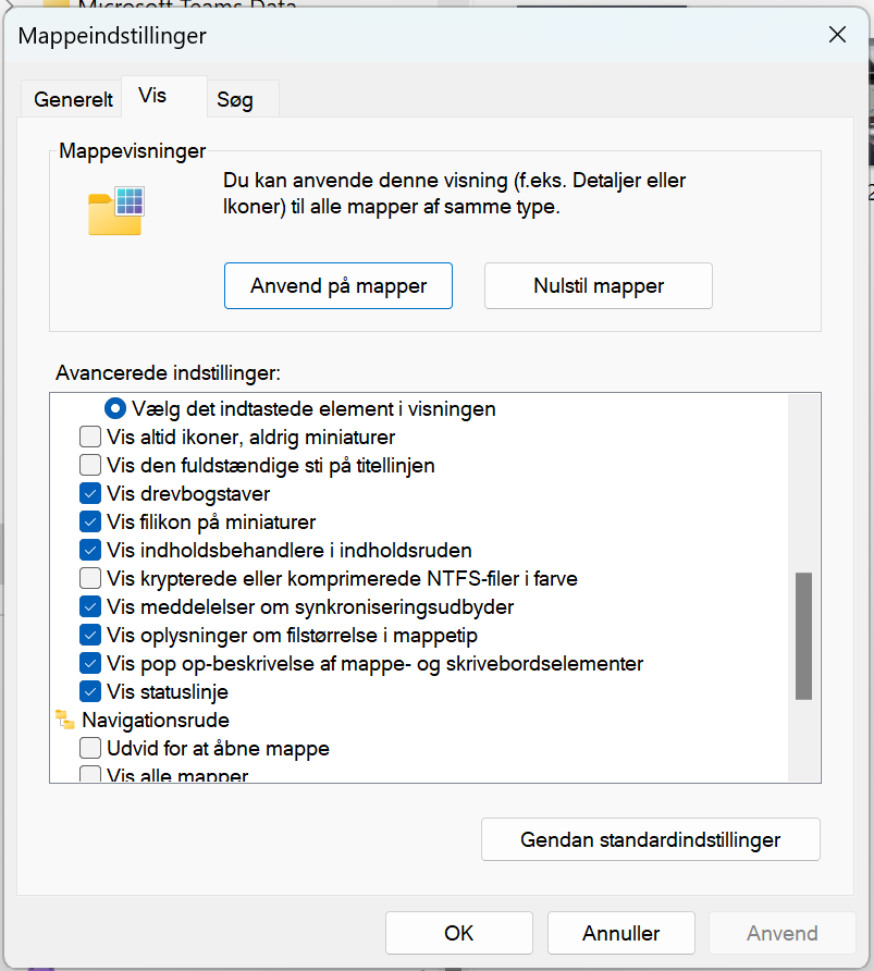 Ved at åbne Stifinderen og vælge indstillingsmenuen (markeret med tre prikker til højre i ikon-linjen), kan du finde ’Indstillinger’ menuen for Stifinderen.