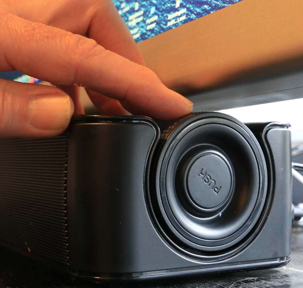 Denne knap er ret smart, da den er stor og stikker helt op, så du kan lade hånden hvile hen over lydbaren, til du finder den rette volumen.