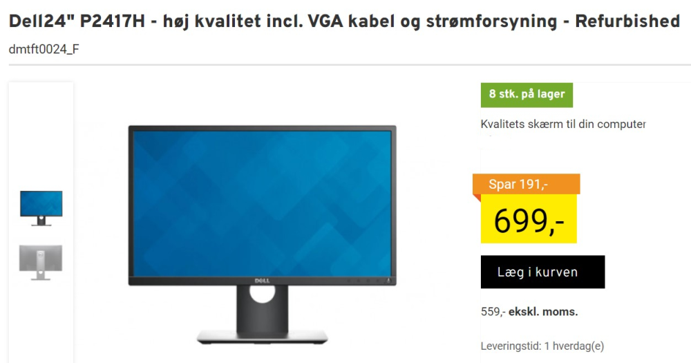 Det kan du næsten også få en skrabet fabriksny model for i dag. En ny Dell P2422H i samme familie som den brugte koster omkring 1.500 kroner.