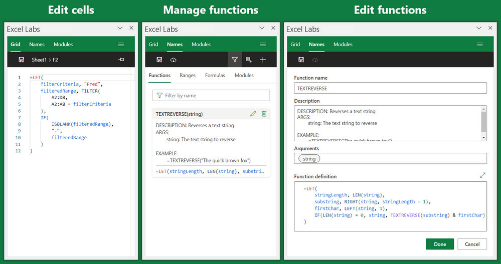 Når tilføjelsesprogrammet er installeret eller opdateret, skal du vælge Excel Labs-knappen på fanen Hjem. Dette åbner Excel Labs funktionsgalleriside, hvor du kan vælge, hvilken funktion du vil bruge. For at vende tilbage til funktionsgalleriet til enhver tid skal du vælge overløbsmenuen i navigationslinjen.