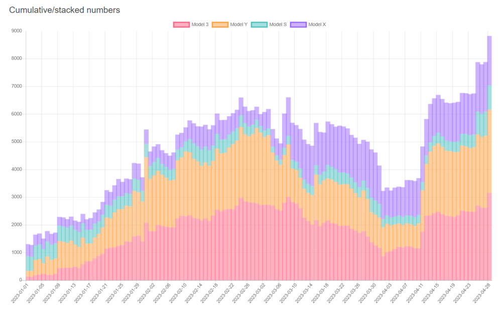 På globalt plan er der nu knap 9.000 Tesla-biler, primært Model 3 og Model Y, mens også en stor del af de dyrere Model X og Model S, der samler støv.