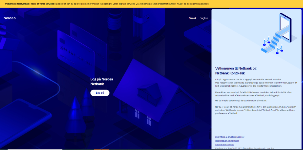 "I øjeblikket kan du opleve problemer med at få adgang til vores digitale services. Vi arbejder på at løse problemet hurtigst muligt og beklager ulejligheden,” lyder meddelelsen på Nordea netbank.