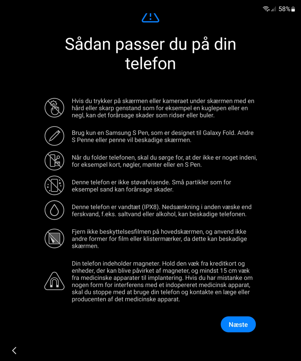 Her minder Samsung venligt, men bestemt om, at enheden på ingen måde er støvtæt og uheldigt placerede kort, nøgler, mønter er farlige for enheden, mens man samtidig kun må anvende den dedikerede S-pen til Fold – Samsungs øvrige penne vil endda skade skærmen, lyder det.