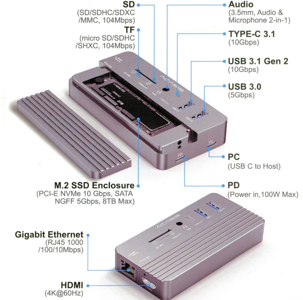 Acasis’ killer-feature er efter min mening en M.2-bås til et NVMe- eller SATA-flashdrev, der kan monteres uden brug af værktøj, være op til 80 mm langt og rumme op til 8 TB data.