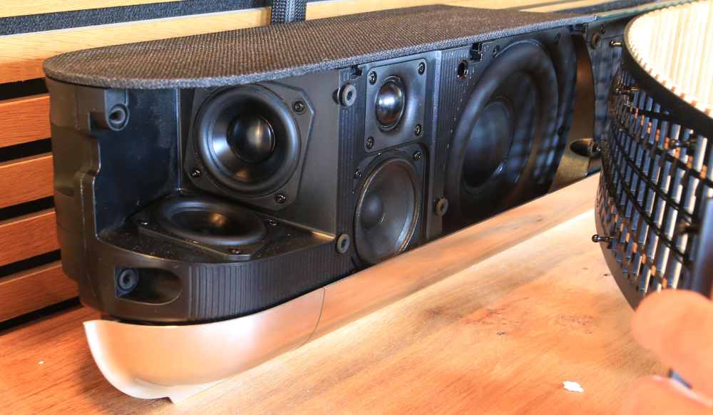 Indvendigt huser Theatre hele 11 højttaler-enheder. To små i hver af siderne, der er med til at generere Dolby Atmos og surroundlyd. Men også solide basenheder og en mellemtone udført som såkaldt coaxial-enhed. Det vil sige med en diskant i midten, som du ofte ser i auto-højttalere.