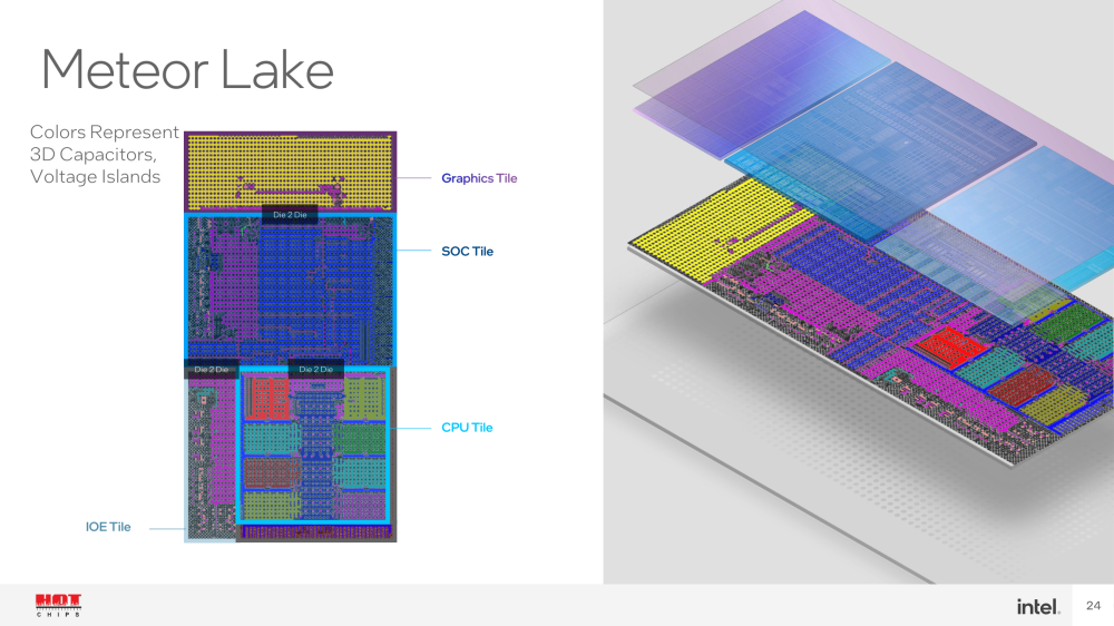Meteor Lake vil bestå af et patchwork af fire forskellige dedikerede enheder, som hver især kan brydes ned i delkomponenter: Compute, grafikchip, input/output samt et integreret ’System on Chip’ som blandt andet huser en neural netværksenhed (NPU).