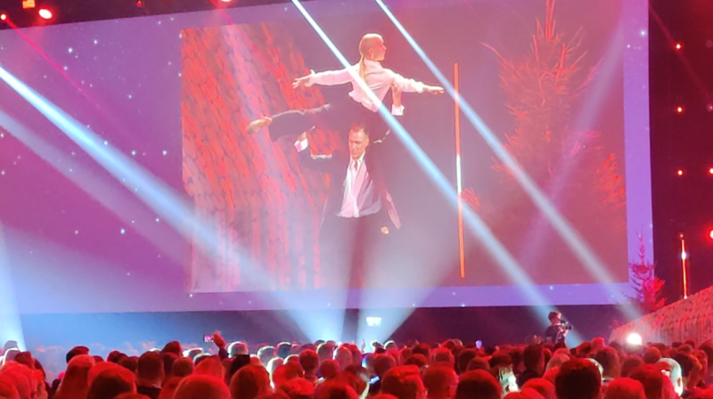 I samme øjeblik, slår højtalerne latinske toner an, kvinden får et målrettet blik i øjnene, og mens salen hujer og jubler går hun ned gennem midtergangen mellem publikumstolene.
