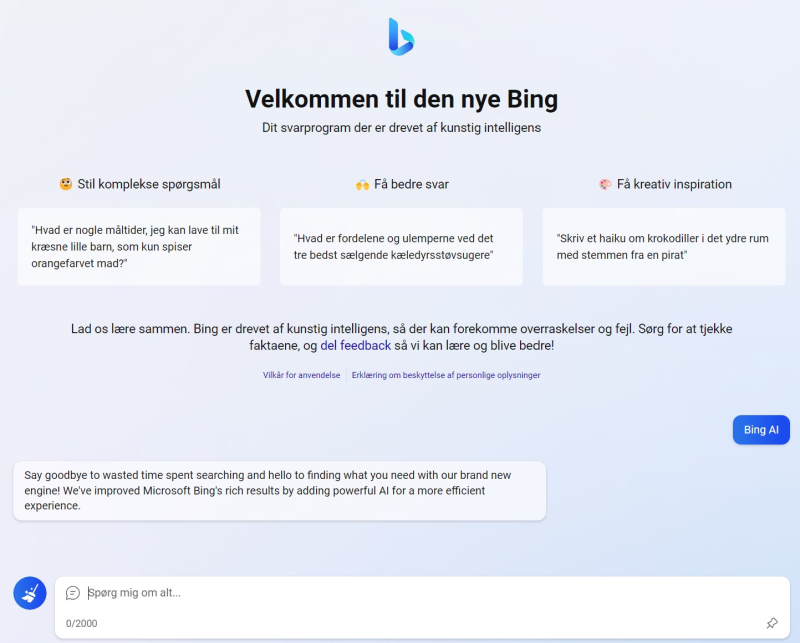 - AI-drevne Bing-oplevelser på bing.com i browsere (gælder for alle større udbydere, herunder Bing Chat, Bing Chat for Enterprise og Bing Image Creator).