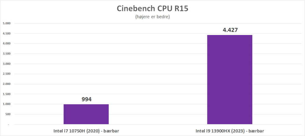 Noget skyldes selvfølgelig en mere effektiv processor, men en stor del af det skyldes, at i7 10750H kommer med seks processorkerner, mens 13900HX tre år senere kommer med 24 kerner.
