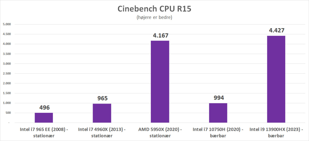 Det er især imponerende, fordi en stationær Intel i7 4960X fra 2013 leverer samme rå ydelse som en syv år yngre i7 10750H-processor til bærbare - men så kommer springet inden for det seneste år, og nu kan en moderne bærbar Intel CPU, i Cinebench R15, slå en tre år gammel topmodel fra AMD.