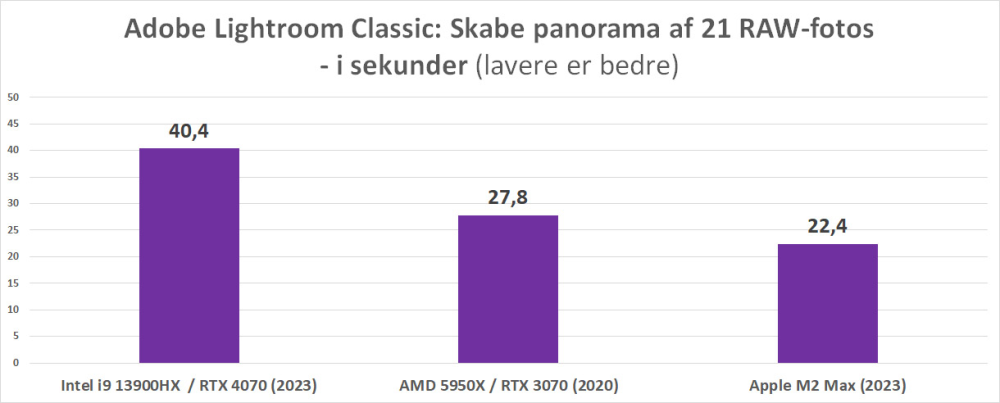 Det skal siges at i9-maskinen kun har 16 gb RAM mod Apples og AMD maskinens 64 gb hvilket spiller lidt ind. Men forskellen er stadig signifikant.