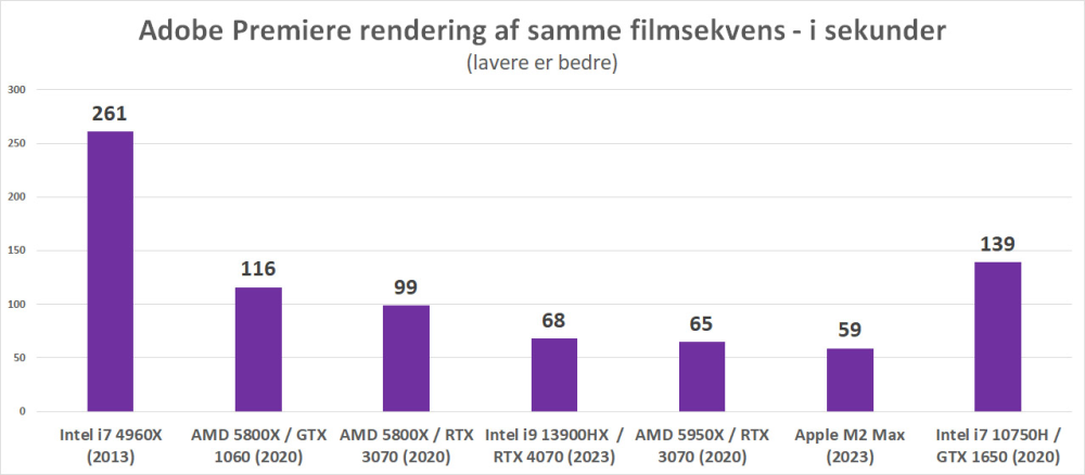Det en ret intensiv opgave, som for nogle år siden tog 261 sekunder, så fik jeg den ned til 116 sekunder med en AMD 5800X processor for at få den ned til 99 sekunder med et bedre grafikkort – for til sidst at få det ned på 65 sekunder med AMD's tidligere topmodel 5950X og samme grafikkort.