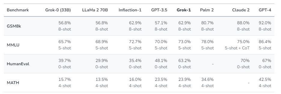 Da xAI startede begyndte selskabet at træne prototypen Grok-0, som på mange parametre er på niveau med Metas Llama-2, mens Grok-1 placerer sig mellem sprogmodellerne GPT 3.5 og Palm 2 i forhold til en række parametre som matematik, kodeudførsel og multiple choice-spørgsmål, skriver xAI i hvert fald selv.