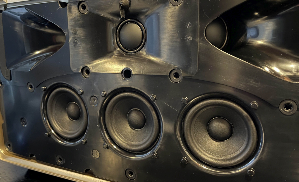 Fronten har hele tre mellemtone-enheder på 2,75”, en større diskant på 1”, samt to diskanter, der spreder lyden ud til siderne.