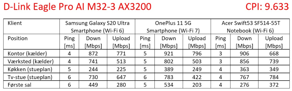 Det hører hjemme i AX3200-klassen, og de ekstra 200 Mbps i forhold til de to andre testdeltagere er brugt til at hæve kapaciteten i 2,4 GHz-frekvensbåndet fra 600 til 800 Mbps. Det lyder ikke af alverden, men kan være en fordel i et hjem/kontor med mange smarte enheder. Dækningsarealet opgives til 740 kvadratmeter.