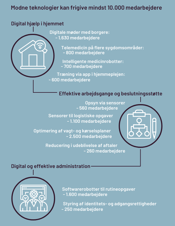 Det gælder områder som digital hjælp i hjemmet, digitale arbejdsgange og beslutningsprocesser, og brugen af softwarerobotter samt bedre styring af identitets- og adgangsrettigheder.