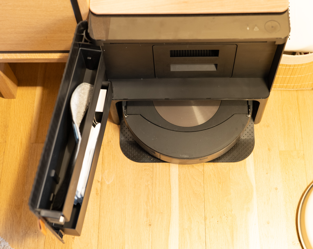 Det bliver først tydeligt, at der er tale om en særlig enhed, når selve basen pakkes ud og åbenbarer en større kasse, der gemmer på både vandbeholder og støvpose, som udveksler henholdsvis støv og vand med robotten, når den kører i dock.