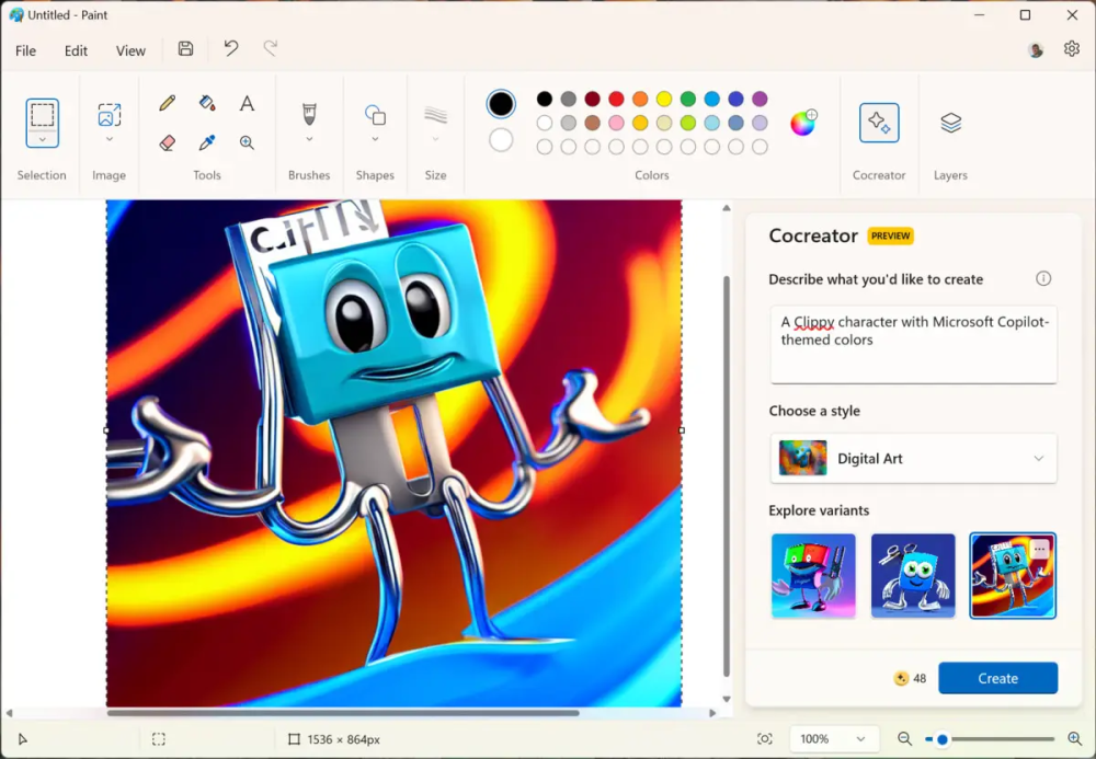 På Windows 11 kan Paint nu generere AI-kunst til dig. Hvis du starter Paint, vil du se en "Cocreator"-knap på værktøjslinjen til det formål. Systemet bruger OpenAIs DALL-E 3-model til at generere billeder. Det fungerer ligesom at bede Copilot om at generere billeder for dig - eller bruge Bing Image Creator .