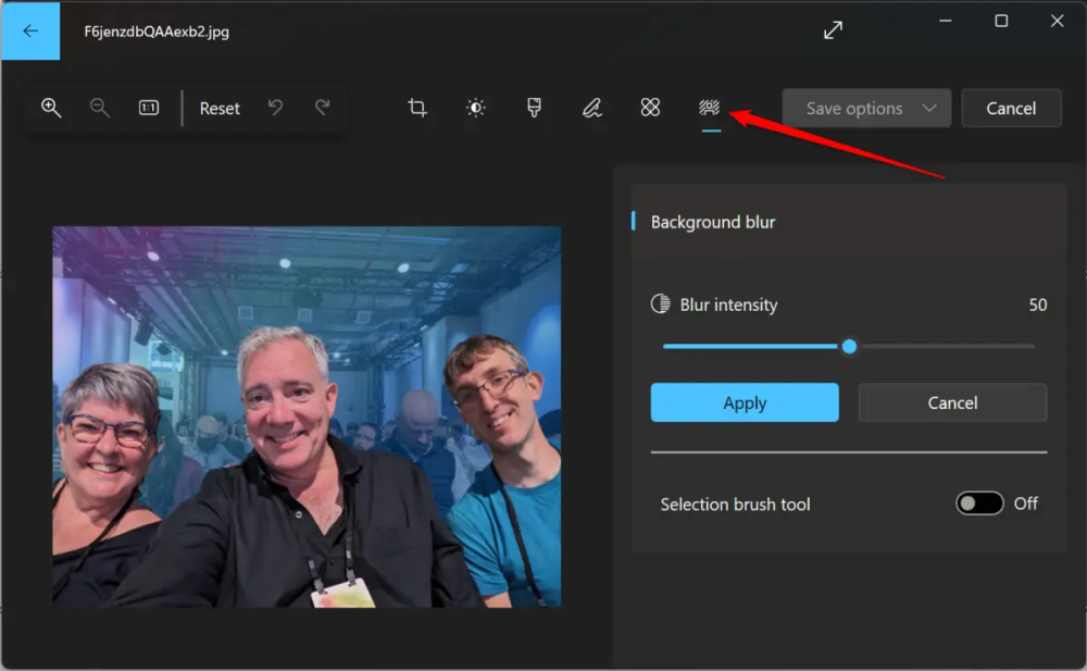 I Fotos-appen skal du klikke på knappen "Rediger billede" øverst i vinduet eller trykke på Ctrl+E. Klik derefter på knappen "Baggrundssløring" på værktøjslinjen.