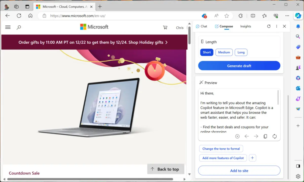 En særlig interessant funktion i er fanen "Skriv". Du kan bruge Edge til hurtigt at komponere afsnit, e-mails, lister over ideer eller blogindlæg med den tone og længde, du foretrækker.