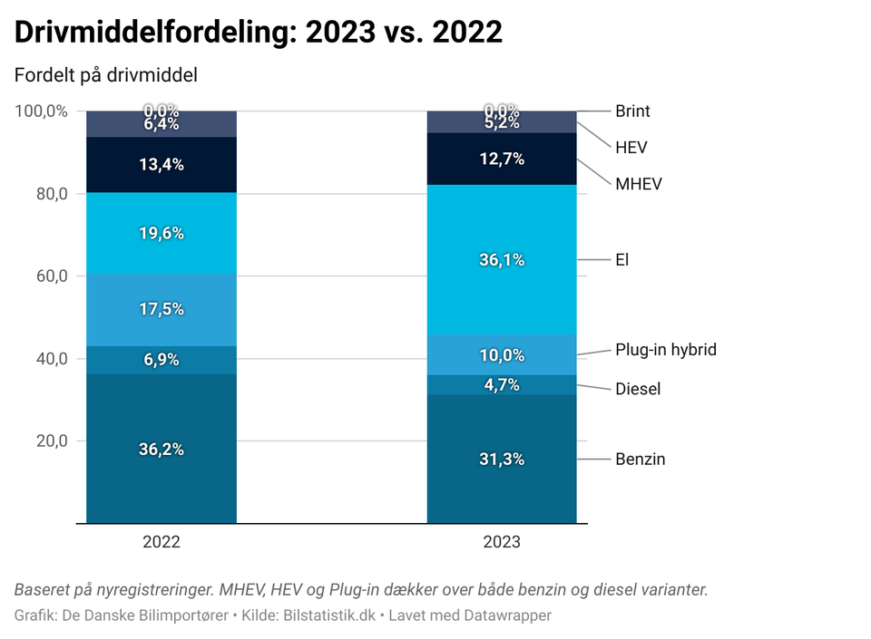 Hybridbiler, med varierende grad af elektrificering af drivlinjen, trænges til gengæld ud af markedet, med en samlet andel på 27,9 procent mod 37,3 procent i 2022. Mens dieselbiler styrer mod udryddelsen med andele der svinder ind fra 6,9 til 4,7 procent.