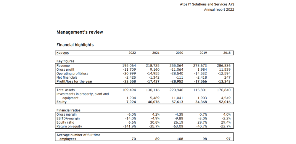 Atos omsætter i Danmark for et par hundrede millioner kroner om året. Både omsætning og antal medarbejdere er faldet støt over de senere år.
