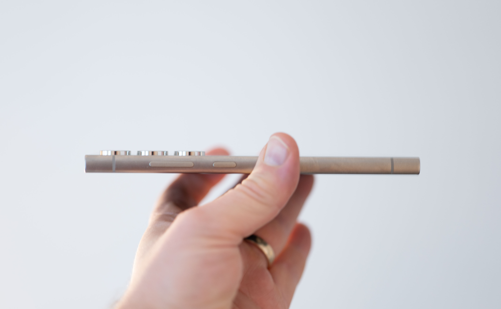 Det ser unægtelig imponerende ud, men som bruger vil man hurtigt erfare, at de spidse kanter vil bore sig ned i håndfladerne på en. Det er ikke synderlig komfortabelt i en mobil, som immervæk vejer det samme som et halvt pund smør.