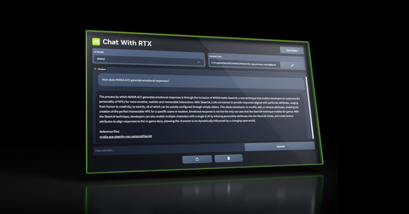 Programmet hedder ’Chat with RTX’ og gør det muligt at køre et udvalg af storskalasprogmodeller uden opkobling til nettet – forudsat at du har en potent maskine at afvikle det på.