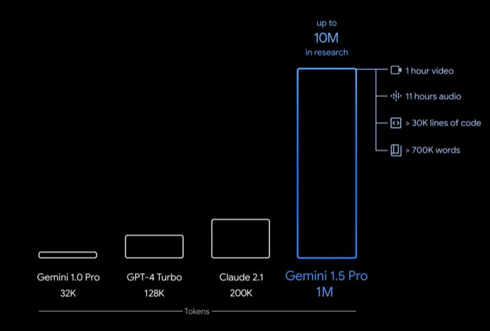 Ved almindeligt brug benytter Gemini 1.5 Pro dog alene 128.000 tokens, det samme antal som i ChatGPT 4.0 Turbo, mens flere altså kan tilgås via AI Studio og Vertex AI. Version 1.0 af Gemini tilbød et kontekstvindue på maksimalt 32.000 tokens.
