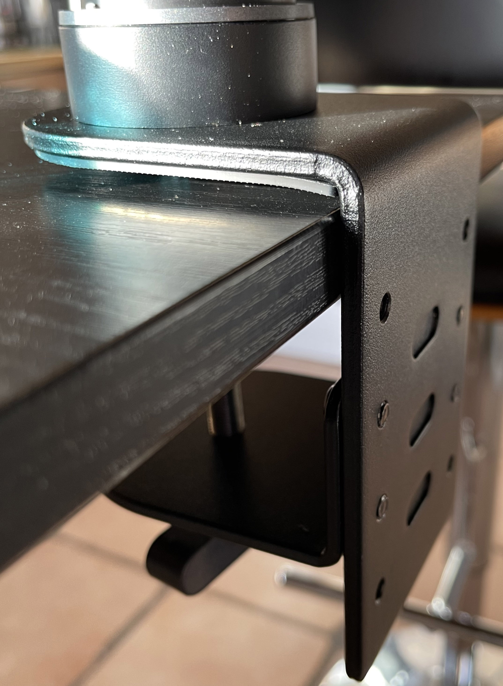 En ekstra bonus er, at der medfølger beslag til montering på bord. Igen er der tale om solidt metal og en behæftning, der gør at skærm armen kan sættes direkte ned i. Det er nu – i mangel af bedre ord - ret lækkert