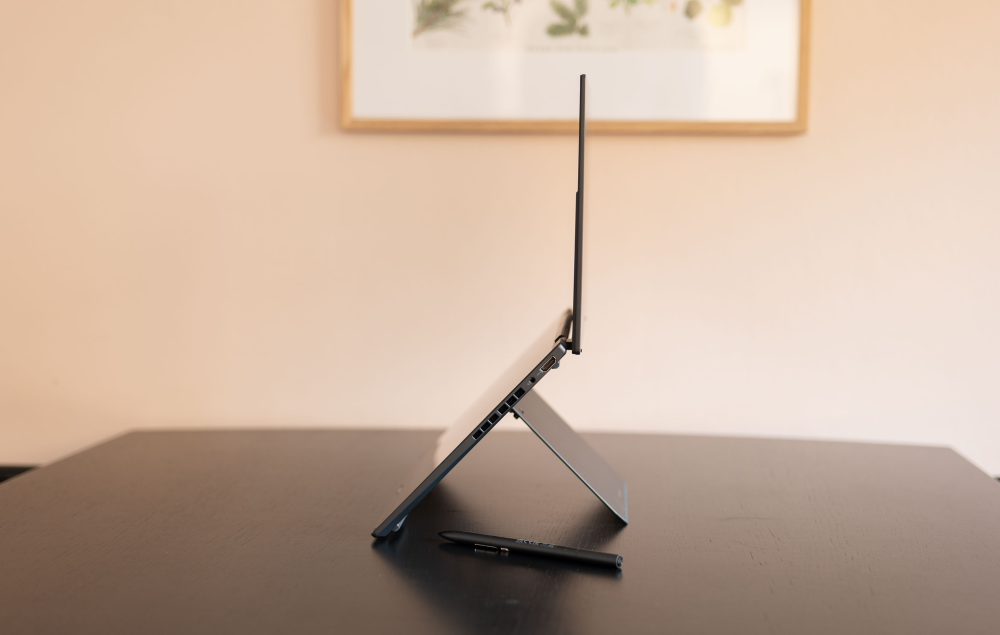 Zenbook Duo ledsages af en digitizer pen, som fungerer glimrende og endda har et par nyttige konfigurerbare knapper. Den har dog en vis vægt og fylde, som til gengæld giver plads til en fiks indbygget USB-C port til opladning.