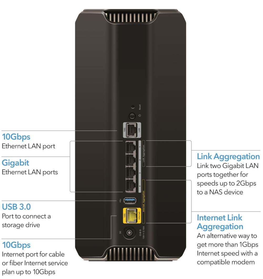Som det er ved at være almindeligt med netværksenheder i de højere klasser, stopper denne router ikke ved de 2.500/2.500 Mbps fiberforbindelser, som er det maksimale, som nogen internettjenesteudbyder lige nu kan levere til SoHo (Small Office/Home Office) kunder.