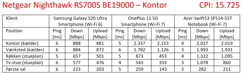 Som sædvanlig har jeg testet routerens trådløse performance ved at bruge appen Speedtest og lade tre klienter registrere pingtid samt download- og uploadhastighed på fem forskellige positioner i mit hus.