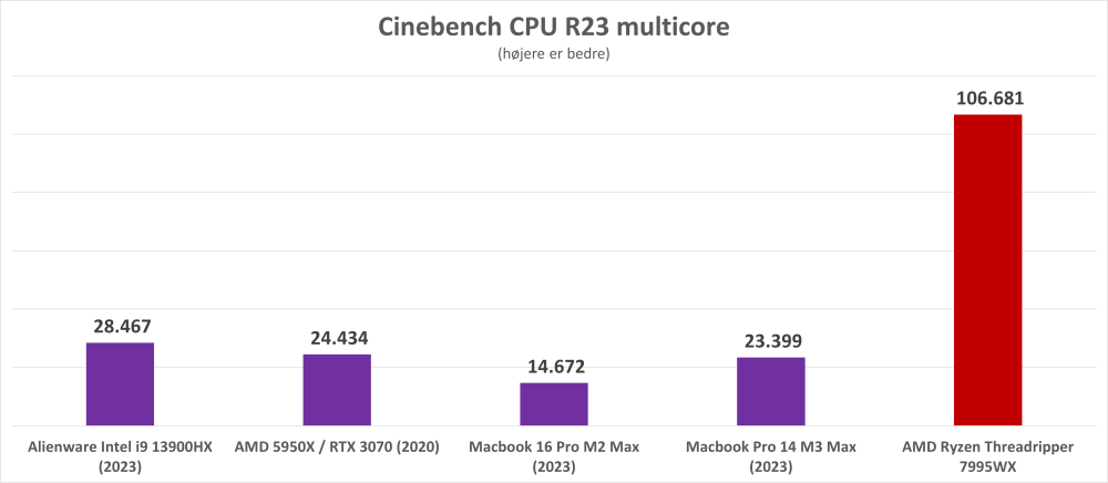 Men begge tal blegner i lyset af resultatet på imponerende 106.681 point fra AMD Threadripper Pro 7995WX processoren med 96 kerner.