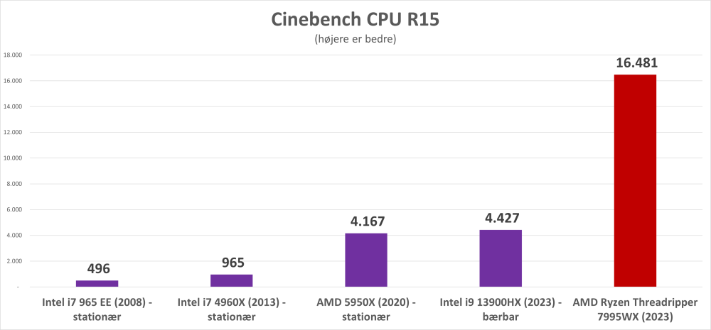 For at få lidt historiske data at sammenligne med, så kørte vi også den ældre R15-udgave af Cinebench, hvor vi har data på udvalgte processorer tilbage til 2008.