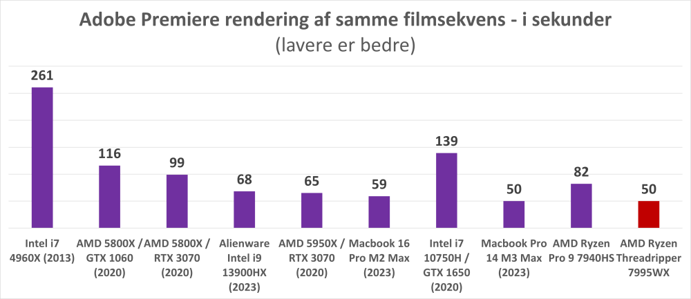 Men AMDs 7995WX-processor blæser dem fuldstændigt af banen. I hvert fald når det kommer til de benchmarks, som vi lagde ud med.