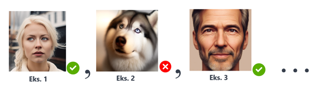 Vis modellen nok eksempler og så vil den trænede AI-model kunne kigge på nye billeder, den ikke har set før, og fortælle os om det er et menneskeligt ansigt eller ikke med høj præcision, fordi den har lært mønstret i, hvad det vil sige, at noget er et ansigt.