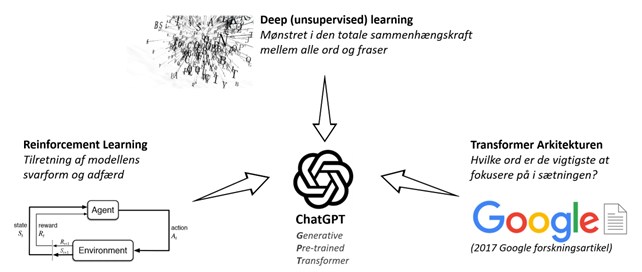 Store sprogmodeller gør mere end at bruge deep unsupervised learning. De benytter også reinforcement learning til at justere modellernes svarform og adfærd og Googles Transformer-arkitektur, men det er også et helt emne i sig selv.