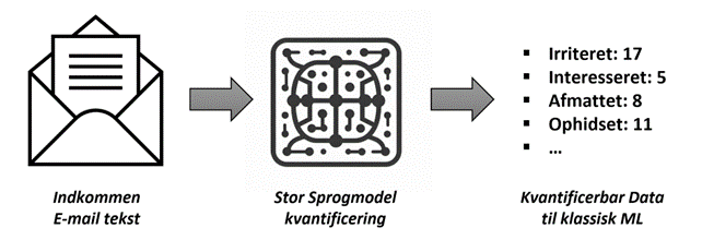 Man kan således bede en stor sprogmodel vurdere fra 0-20 hvor irriteret, interesseret, afmattet, ophidset og så videre ordlyden er i en e-mail eller anden sproglig udveksling med kunden er, og benytte disse tal som input til en klassisk ML-model.