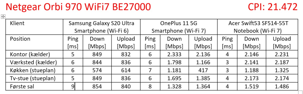 Hvis du er i tvivl om potentialet i den seneste, nu officielt snart et halvt år gamle, wi-fi 7-teknologi, så brug lidt tid på at nærlæse skemaet med mine i alt 45 måleresultater fra tre trådløse klientenheder på fem positioner i mit hus på godt 200 etagemeter fordelt på tre plan.