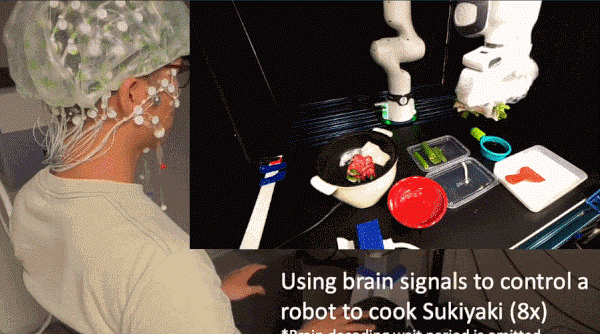 I eksemplet her laver testpersonen en sandwich ved at personen sender hjernesignaler til en robotarm, der så udfører de ønskede bevægelser.