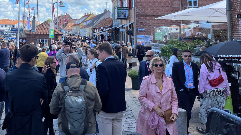 Det var en lys og solrig dag i Allinge, og stemningen var munter. Der er en slags byfest over hele arrangementet. Et safe space, hvor politikere, journalister og resten af kommentatoriet kan slå sig løs.