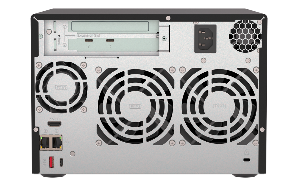 På bagpanelet er der plads til endnu et udvidelseskort, og her har jeg under testen haft monteret et Qnap QXG-10G2TB PCIe-kort med to LAN-porte, hver med en hastighed på op til 10 Gbps.