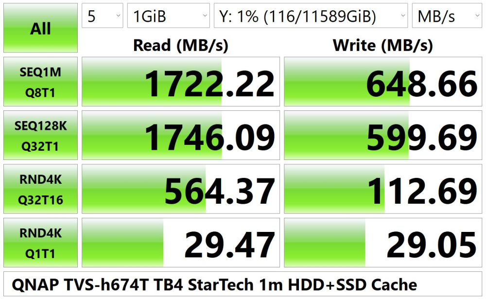 CrystalDiskMark måler op til 1.746,22 MBps, hvad der er det samme som 13,97 Gbps og sandsynligvis skyldes den store SSD-cache.