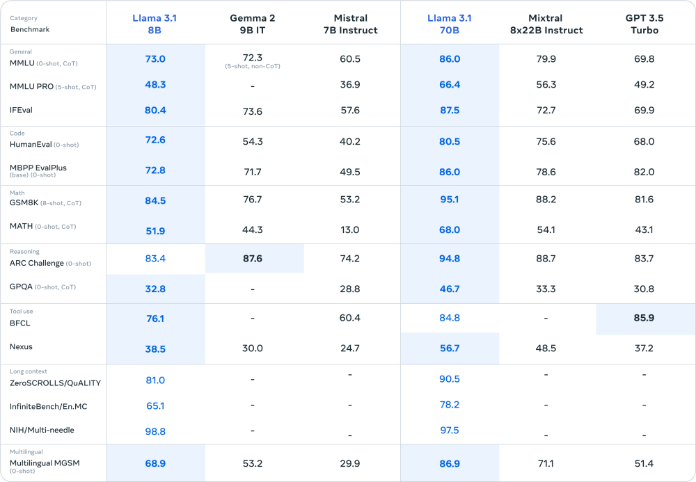 Samtidig dyster Llama 3.1 405B med Anthropics nye Claude 3.5 Sonnet om at være bedst i striben af benchmarks, som vurderer modellernes evner indenfor en stribe discipliner såsom kodning, matematik, ræsonnement, flersprogethed og generelle forespørgsler.