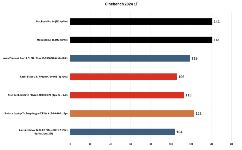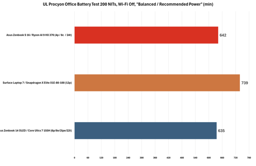 Her er den testede Asus Zenbook S 16 handikappet af sin større 16 skærm, men hjulpet på vej af hele 78 Wh batteri, hvor Intel-modellen har 14” OLED og et 75 Wh batteri og Surface Laptop 7 med Elite X processor har en beskeden 13,5” skærm og et endnu mere beskedent 54 Wh batteri.