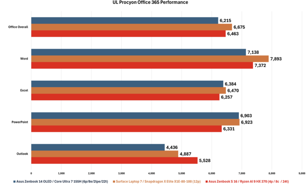 Måler man ydelse i en mere alsidige opgaver som i benchmark-programmet Procyon Office 365, placerer den nye AMD-CPU sig foran Intels Core 7 Ultra og under Snapdragon X Elite.
