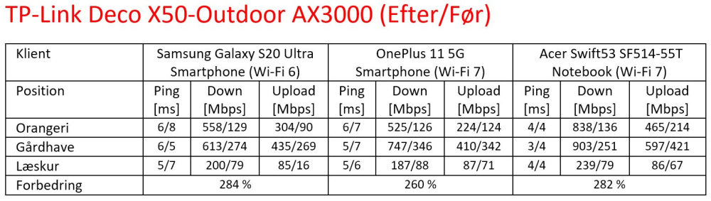 Jeg har Speedtestet wi-fi-dækningen i henholdsvis orangeriet (5 meters afstand), gårdhaven (3 meters afstand) og læskuret (12 meters afstand) efter og før tilføjelsen af mesh-satellitten. Forbedringerne er virkelig til at tage og føle på.